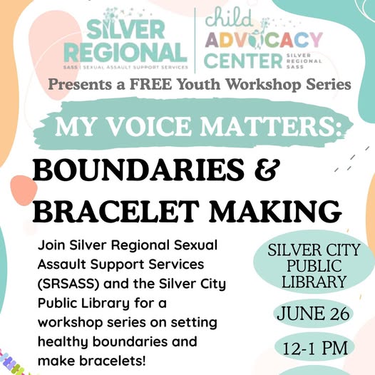 The Silver Regional Sexual Assault Support Services (SASS) will be coming to the library on Thursday, June 26th, at 12:00 pm for a free youth workshop on setting boundaries. We will be making bracelets while a skilled facilitator leads discussion about what it takes to create safe and healthy boundaries. This activity is great for teens.
